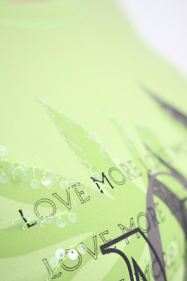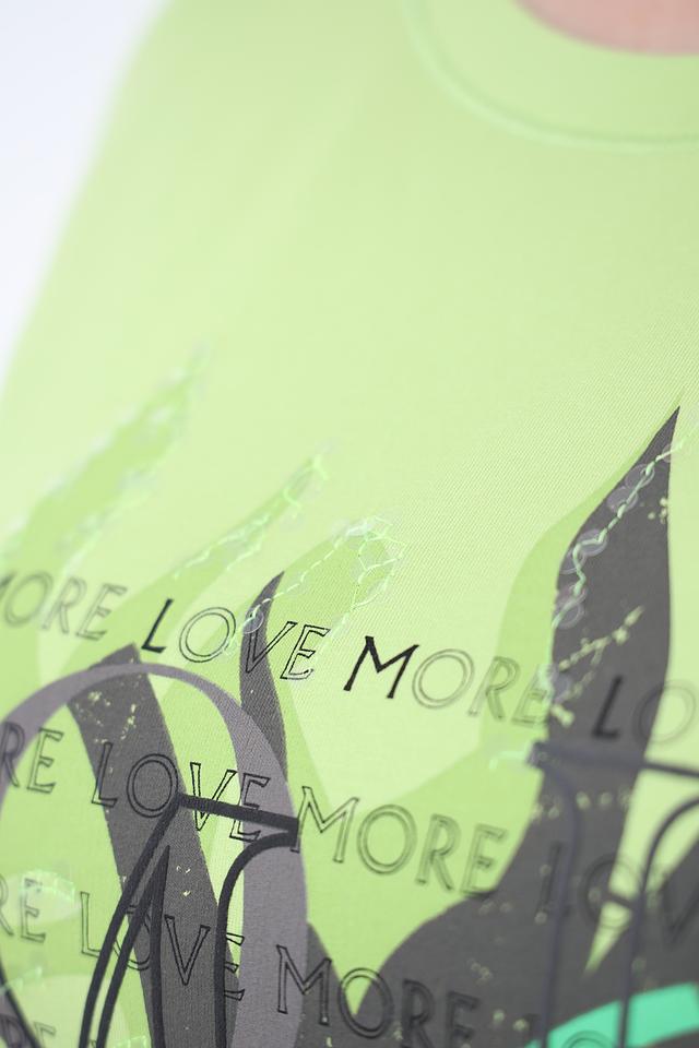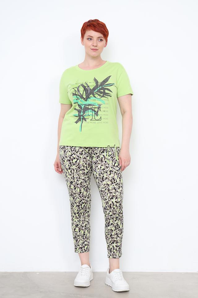 Футболка имеет прямой крой и короткий рукав, что делает ее универсальной для различных типов фигур. Основной цвет – лайм, который освежает и придает образу яркость. Главная особенность модели – стильный принт с изображением пальмовых листьев и надписями, выполненный в контрастных тонах.