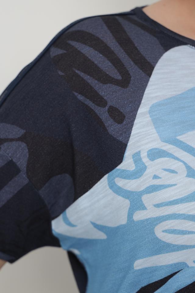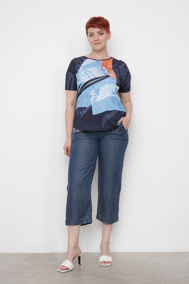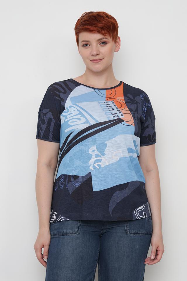 Женская футболка Rabe collection синего цвета с ярким абстрактным принтом. Модель выполнена из мягкого и приятного к телу сочетания вискозы и хлопка, обеспечивая комфорт в носке. Состав: вискоза 50%, хлопок 50%