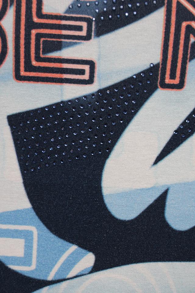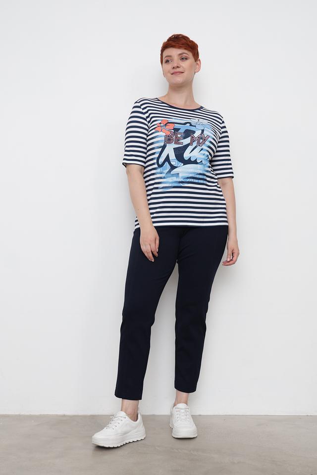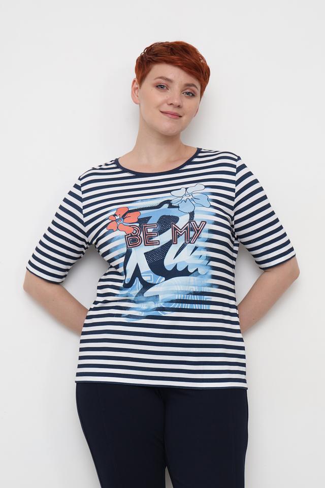 Женская футболка Rabe collection синего и белого цвета с ярким принтом. Модель выполнена из мягкой вискозы с добавлением эластана, обеспечивающего комфортную посадку. Футболка идеально подойдет для создания повседневных образов. Состав: вискоза 96%, эластан 4%