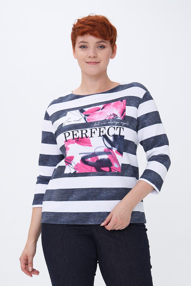 Женский пуловер Rabe collection синего и белого цвета с ярким цветочным принтом. Модель выполнена из мягкого трикотажа с добавлением хлопка, полиэстера и эластана, что обеспечивает комфорт и удобство в носке. Состав: хлопок 76%, полиэстер 16%, эластан 8%