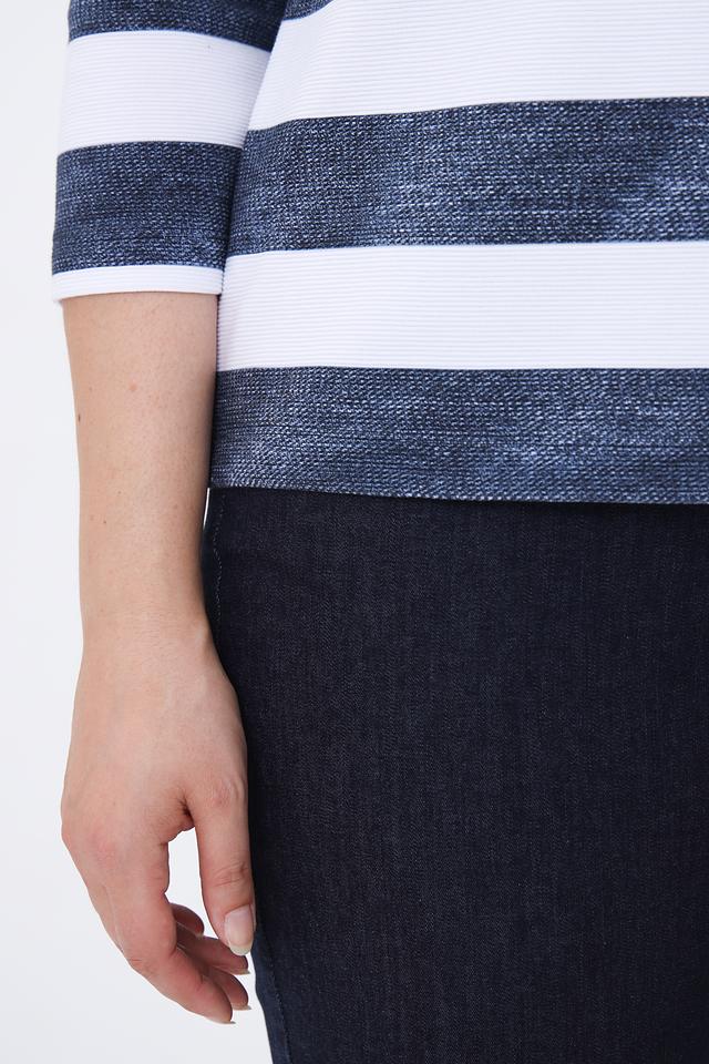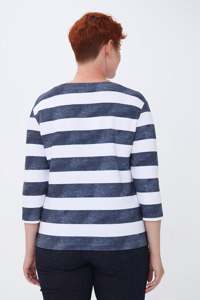 Модель имеет удобный вырез горловины и рукава длиной 3/4. Пуловер изготовлен из высококачественного трикотажа, в состав которого входит 76% хлопка, 16% полиэстера и 8% эластана. Такое сочетание материалов обеспечивает комфорт, мягкость и хорошую посадку по фигуре.