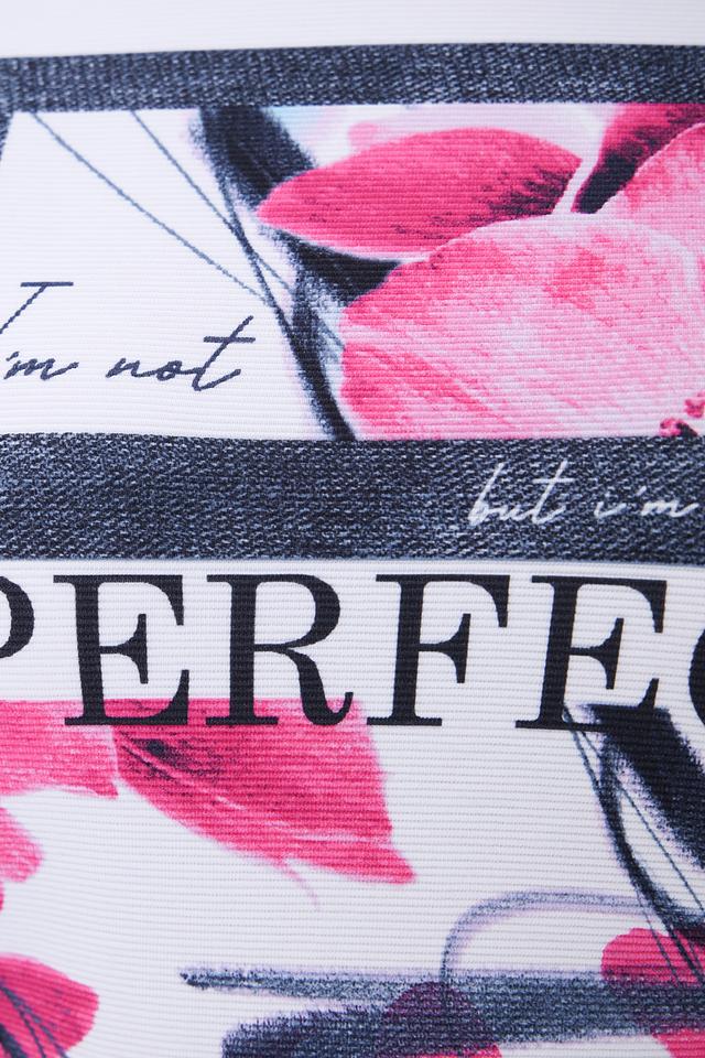 Передняя часть пуловера украшена крупным, ярким цветочным принтом с изображением розовых бутонов и надписью “PERFECT”. Принт добавляет образу оригинальности и женственности.