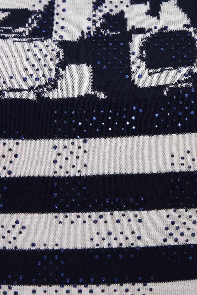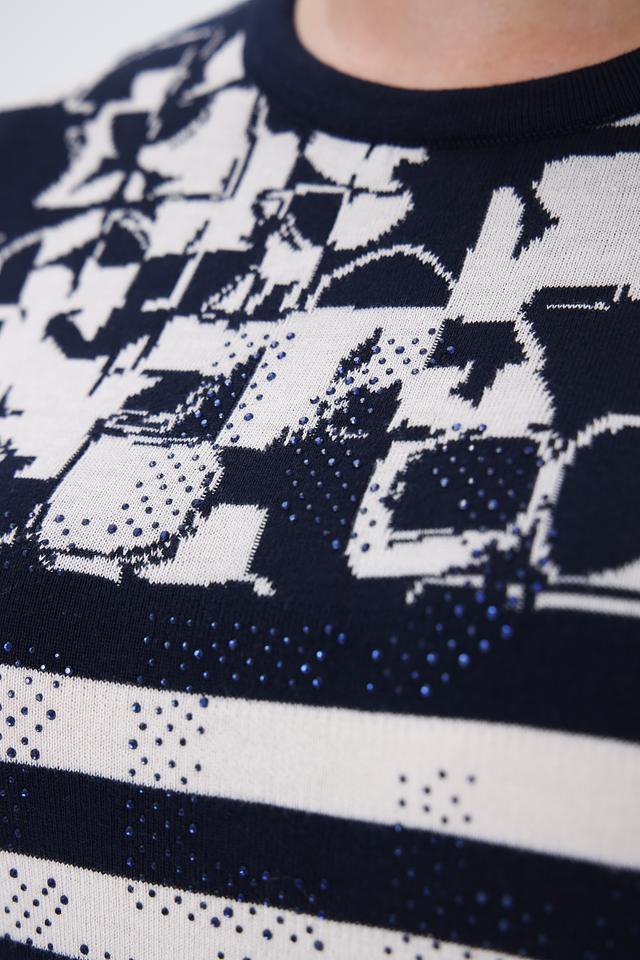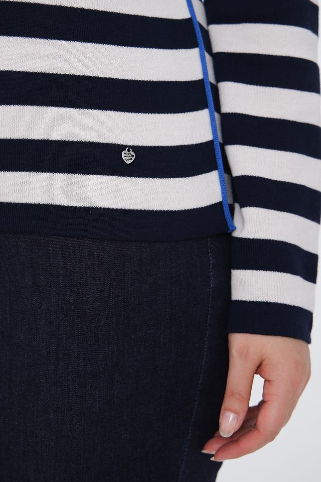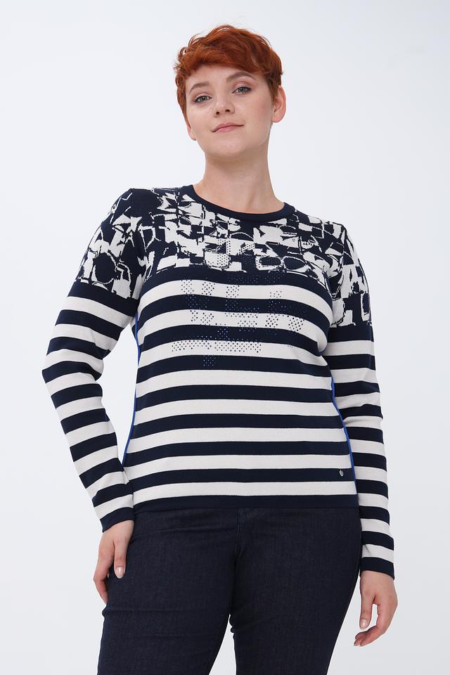 Этот стильный пуловер от Rabe collection станет отличным дополнением к вашему гардеробу. Пуловер выполнен в сочетании темно-синего и белого цветов в классическую полоску, а верхняя часть украшена ярким цветочным принтом.
