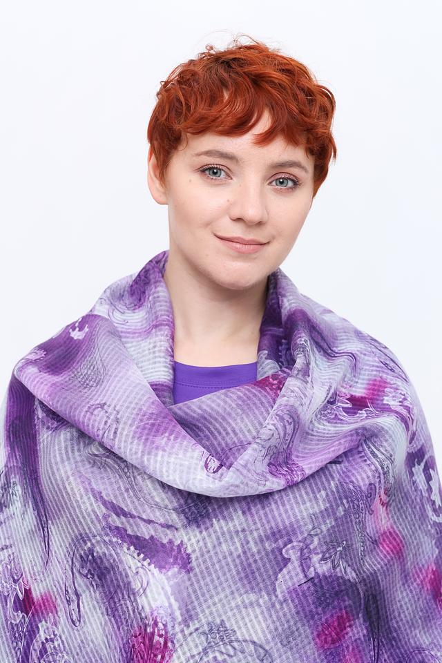 Этот шарф от Rabe collection – прекрасный выбор для тех, кто ценит элегантность и комфорт. Шарф выполнен в нежной фиолетовой гамме и украшен ярким цветочным принтом, который добавит образу женственности и изысканности.