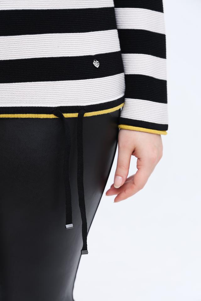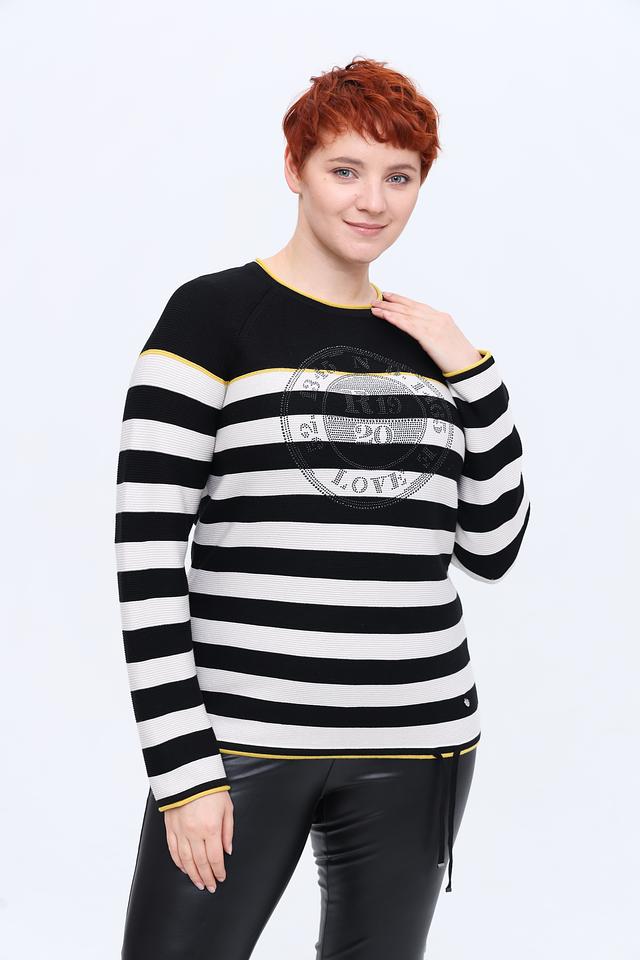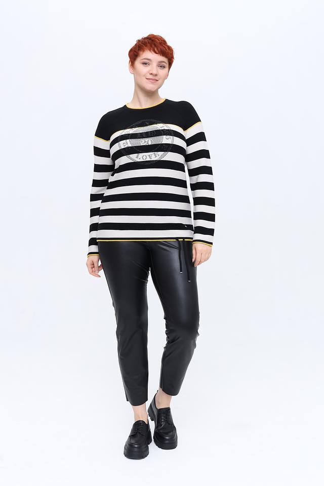 Основной цвет изделия – чёрный, дополненный широкими белыми полосами. На передней части пуловера расположена декоративная аппликация с изображением надписи “LOVE” и другими элементами, выполненная в золотистом цвете.