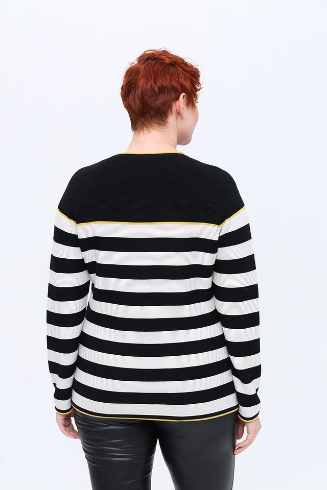 Чёрный пуловер от Rabe collection с полосатым узором и декоративной аппликацией. Модель выполнена из мягкого сочетания хлопка и полиакрила, обеспечивающего комфорт и удобство в носке. Состав: хлопок 50%, полиакрил 50%