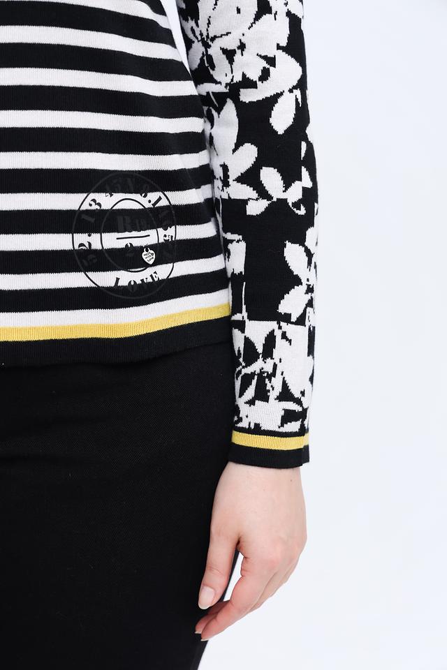 Этот стильный пуловер от Rabe collection станет отличным дополнением к вашему гардеробу. Пуловер выполнен в черно-белой цветовой гамме, сочетающей в себе полосатый узор и цветочный принт.