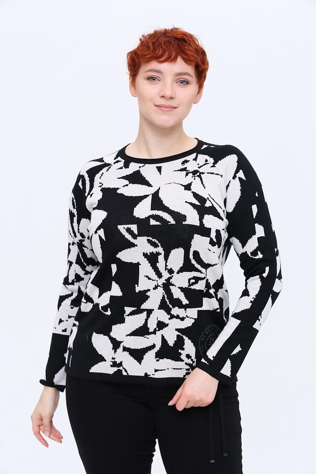 Основной цвет пуловера – чёрный, а ярким акцентом является крупный белый цветочный принт, который придает изделию свежий и женственный вид. Пуловер имеет слегка свободный силуэт, который не сковывает движений и обеспечивает комфортную посадку по фигуре.