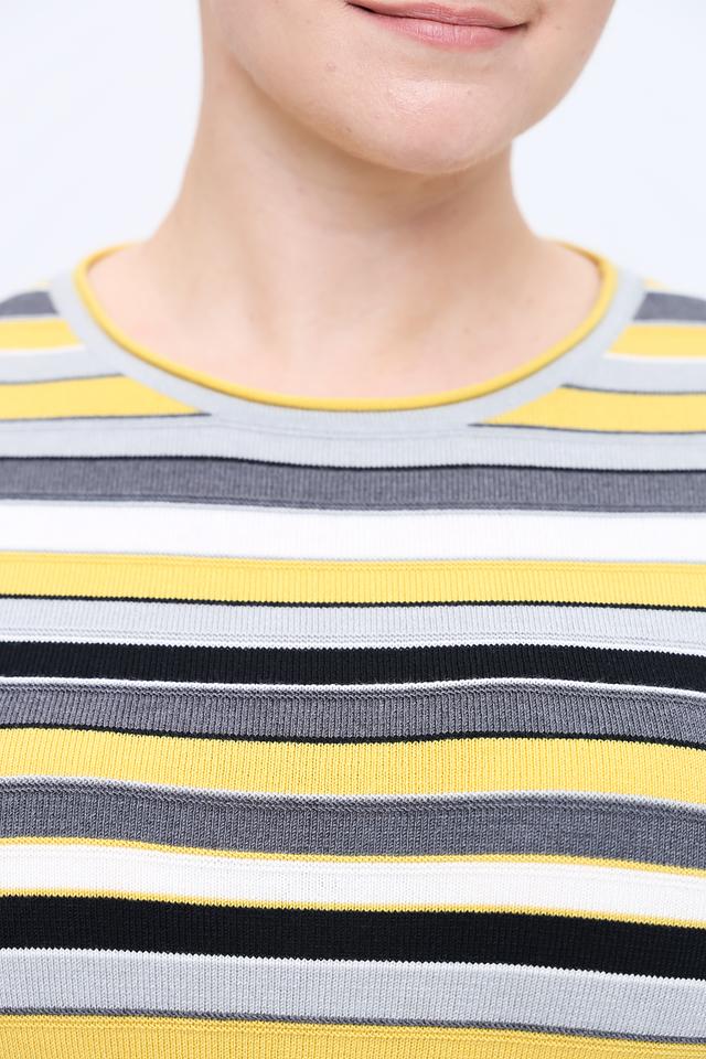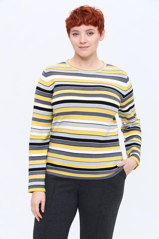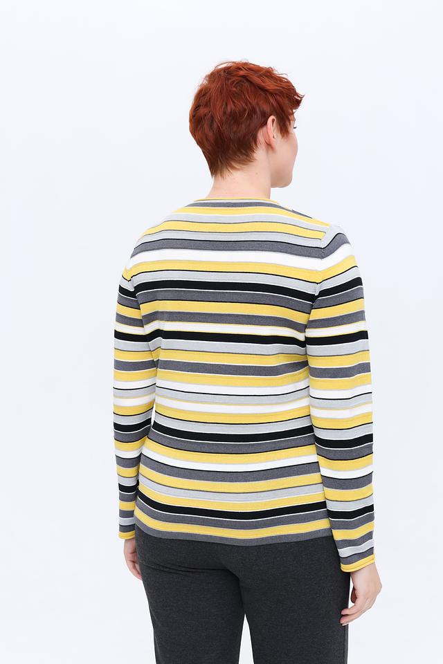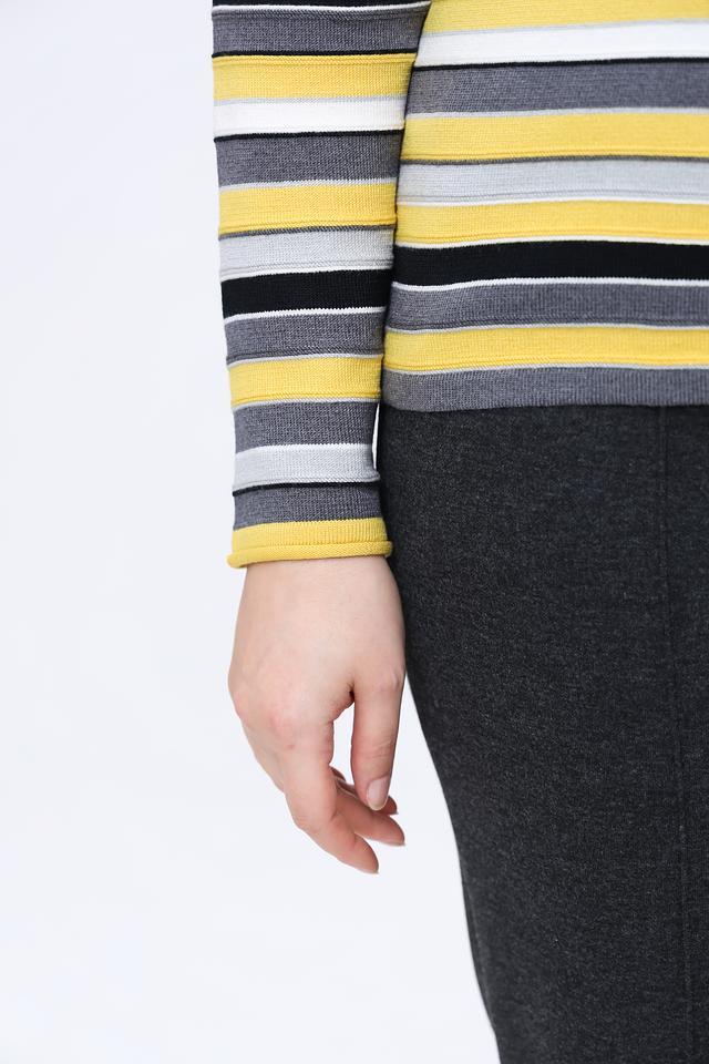 Пуловер имеет яркий полосатый дизайн в жёлто-серых тонах, который добавит образу свежести и динамики. Классический крой и круглый вырез горловины делают его универсальным и подходящим для различных случаев.