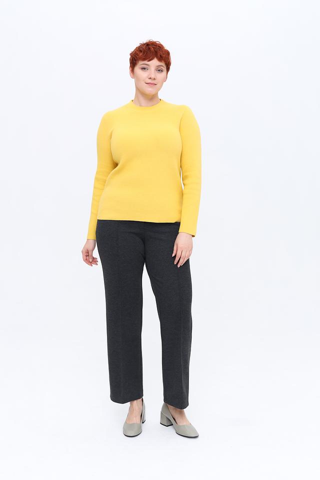 Модель имеет классический крой с круглым вырезом горловины и длинными рукавами. Пуловер плотно прилегает к фигуре, подчеркивая её достоинства, но при этом не сковывает движений.