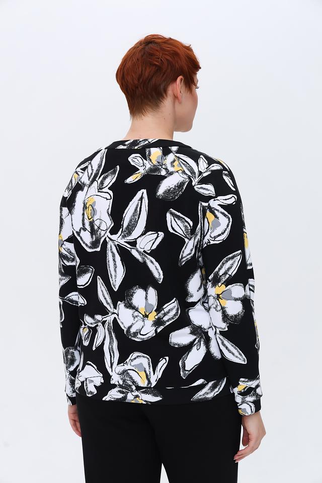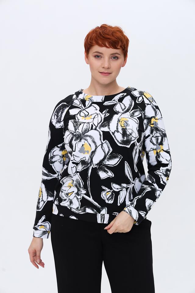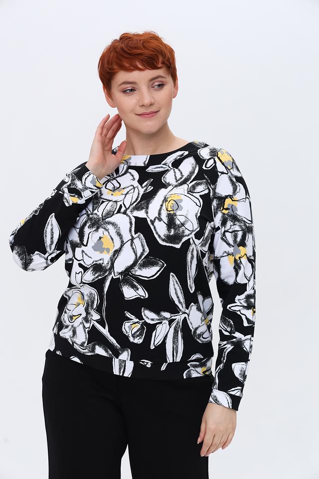 Женский пуловер Rabe collection чёрного цвета с ярким цветочным принтом станет стильным дополнением к вашему гардеробу. Модель выполнена из мягкого и приятного к телу трикотажа, обеспечивающего комфорт в носке. Состав: хлопок 47%, модал 47%, эластан 6%
