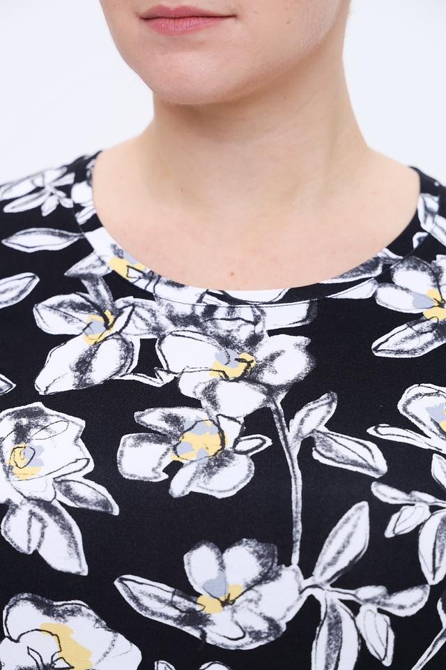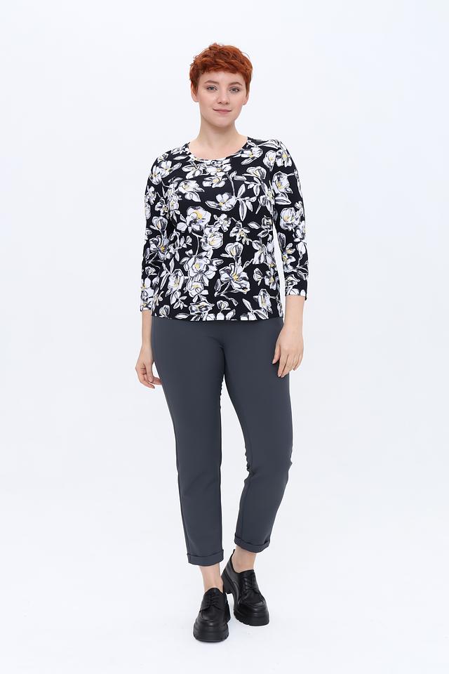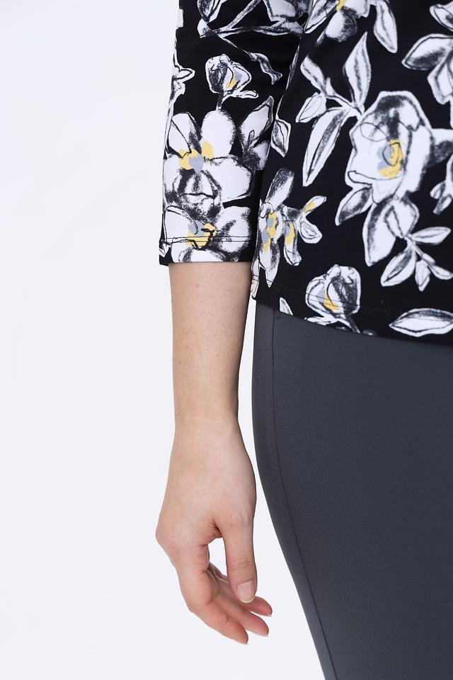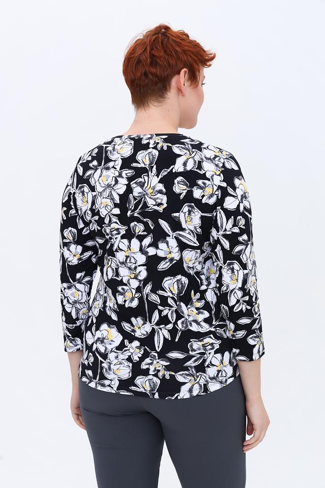 Эта стильная блуза от Rabe collection выполнена в чёрном цвете и украшена крупным цветочным принтом, состоящим из белых, жёлтых и серых оттенков. Блуза имеет округлый вырез горловины и короткие рукава 3/4, что делает её идеальным выбором для тёплой погоды.