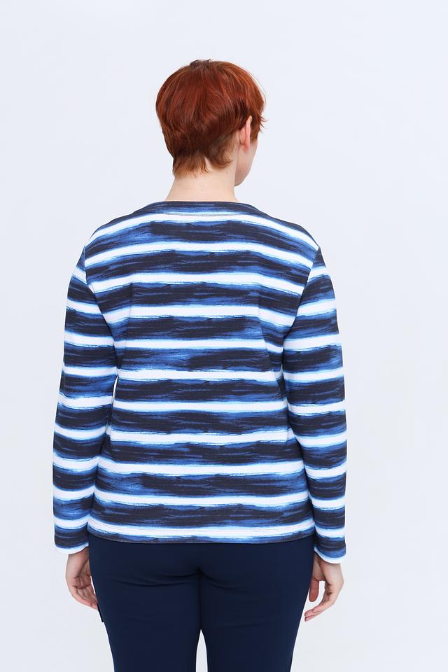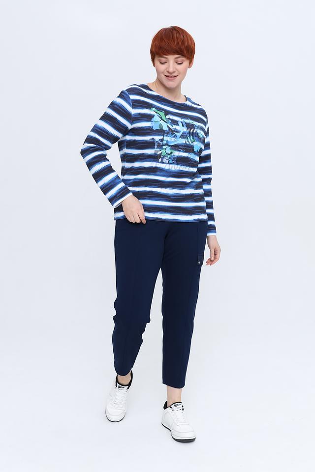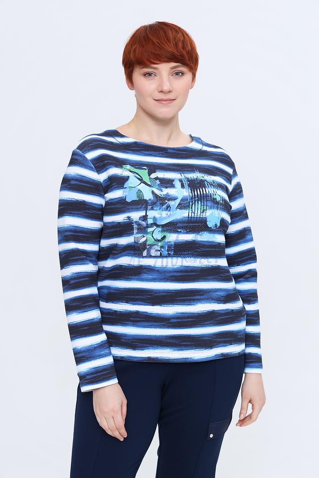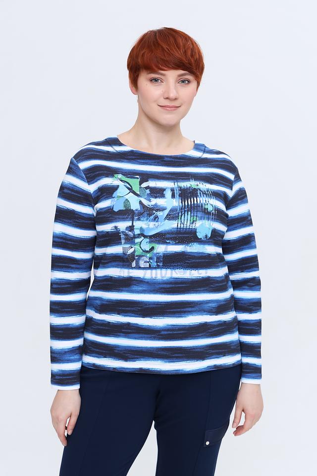 Женский пуловер Rabe collection синего цвета с ярким полосатым принтом и цветочным рисунком. Модель выполнена из мягкого и приятного к телу трикотажа, обеспечивающего комфорт в носке. Состав: хлопок 76%, полиэстер 16%, эластан 8%