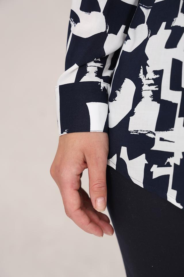 Рубашка Rabe collection темно-синего цвета с оригинальным абстрактным принтом станет стильным дополнением к вашему гардеробу. Модель выполнена из мягкой вискозы, обеспечивающей комфорт в носке. Состав: вискоза 100%