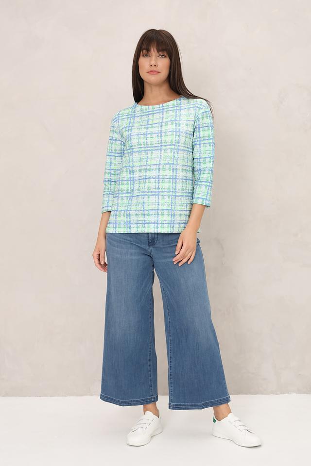 Женский пуловер Rabe collection светло-зелёного цвета с клетчатым принтом. Модель с округлым вырезом горловины и рукавом 3/4 станет отличным дополнением к вашему гардеробу. Состав: хлопок 60%, полиэстер 35%, эластан 5%