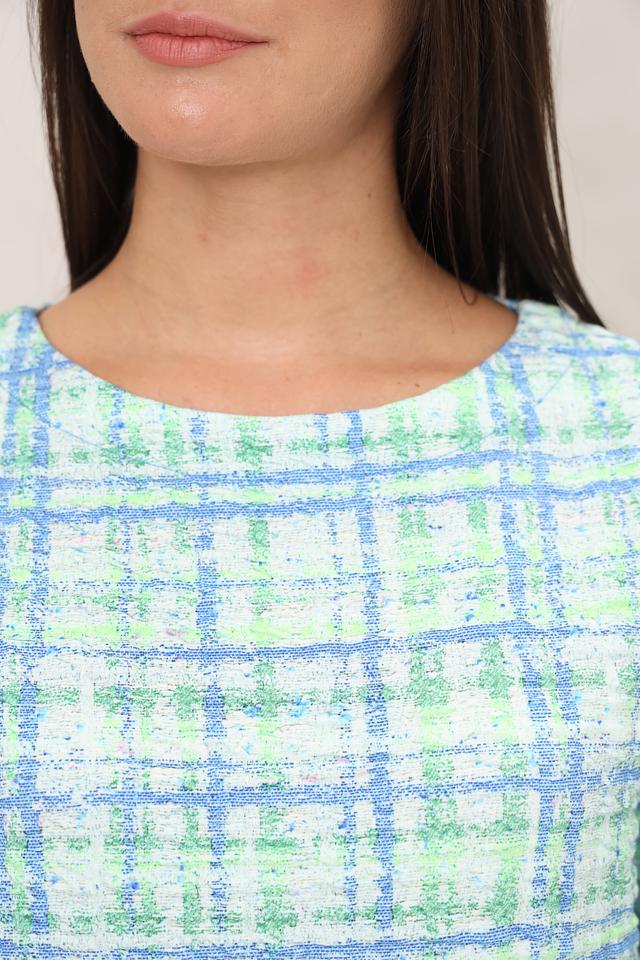 Особенностью данного пуловера является его клетчатый принт, выполненный в светло-зелёных и голубых тонах. Этот принт добавляет образу свежести и лёгкости.