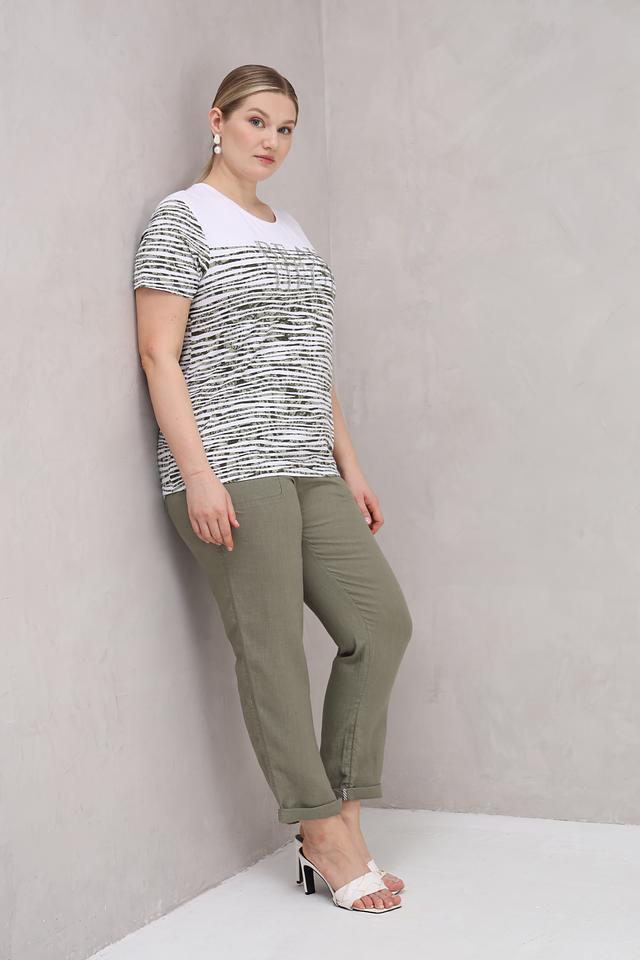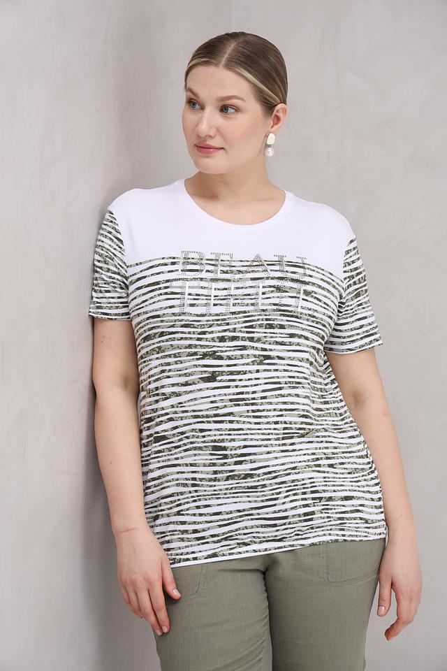 Женская футболка Rabe collection хаки с оригинальным принтом и декоративной отделкой. Модель выполнена из мягкой вискозы с добавлением эластана, обеспечивающего комфортную посадку по фигуре. Состав: вискоза 92%, эластан 8%