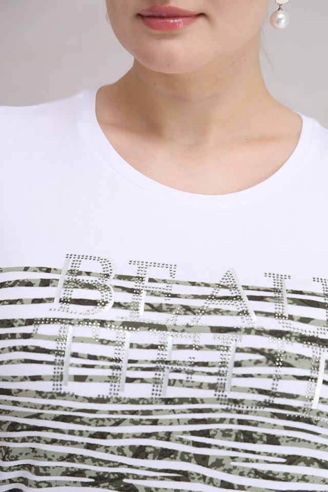 Футболка имеет прямой крой и короткий рукав. Основной цвет – хаки, дополненный ярким белым принтом с надписью, выполненной с использованием декоративных элементов. Принт создает интересный визуальный эффект и добавляет образу индивидуальности.