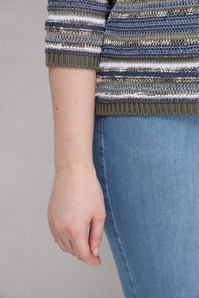 Этот стильный пуловер от Rabe collection выполнен в полосатом дизайне, сочетающем в себе различные оттенки серого, синего и белого. Модель имеет удобный крой и длину, подходящую для создания различных образов.