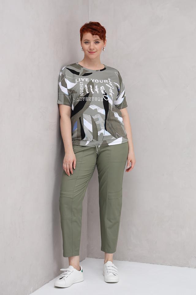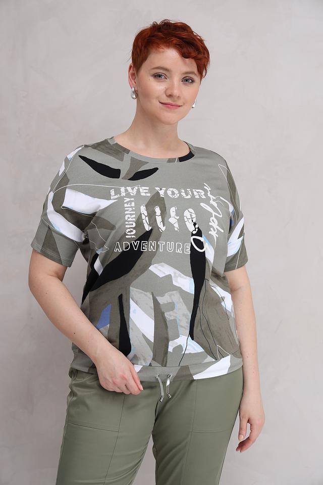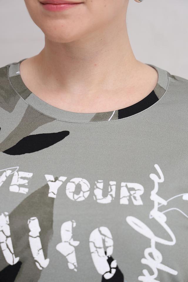 Женская футболка Rabe collection хаки с оригинальным камуфляжным принтом и надписью. Модель выполнена из мягкого и приятного к телу трикотажа, обеспечивающего комфорт в течение дня. Стильный и современный выбор для повседневного образа. Состав: хлопок 47%, модал 47%, эластан 6%