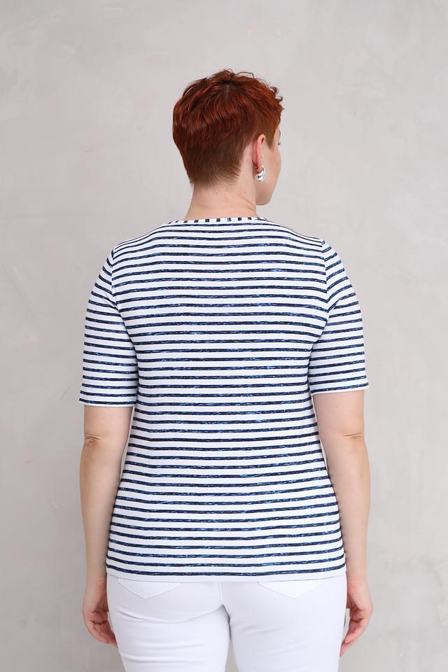Женская футболка Rabe collection синего цвета с ярким цветочным принтом. Модель выполнена в полоску, имеет короткий рукав и удобный крой. Изготовлена из мягкой вискозы с добавлением эластана. Состав: вискоза 96%, эластан 4%