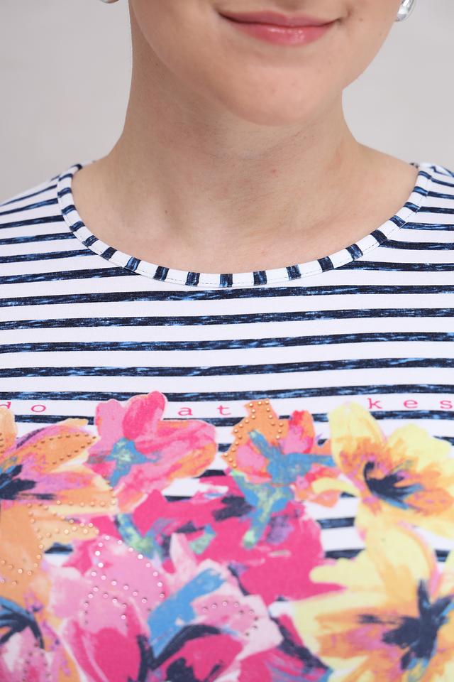 Основной цвет футболки – синий, она оформлена горизонтальными полосами. Главная деталь дизайна – яркий цветочный принт, расположенный на передней части изделия. Принт выполнен в разнообразной цветовой гамме, включая розовые, желтые и зеленые оттенки.