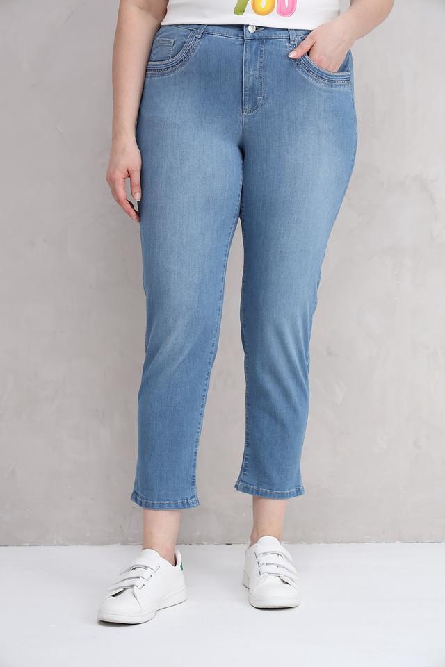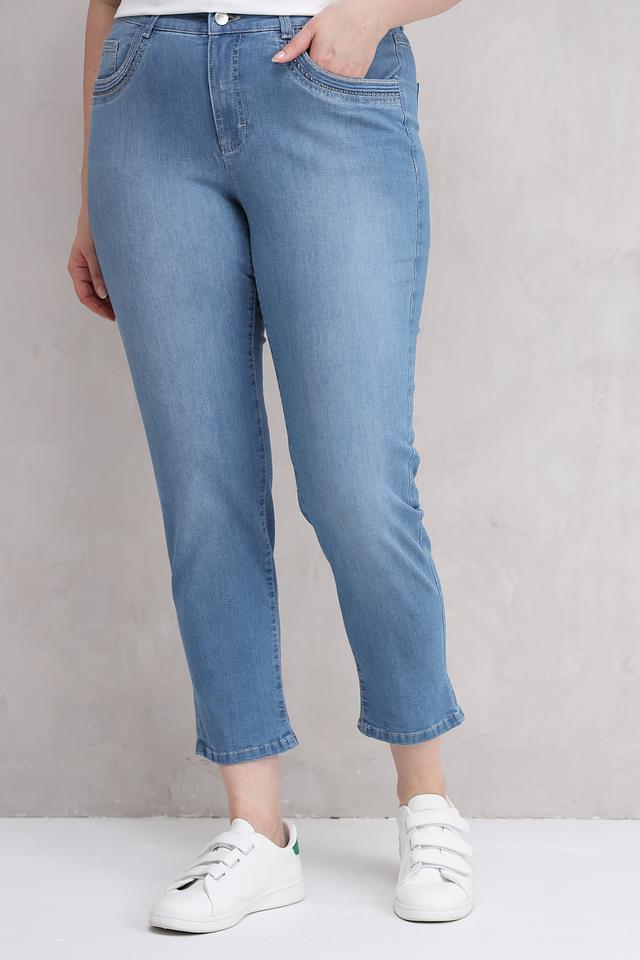 Джинсы имеют зауженный к низу силуэт, который визуально стройнит ноги и придает образу элегантность. Средняя посадка обеспечивает комфорт в течение всего дня. Карманы с декоративной отделкой в виде страз добавляют изюминку.
