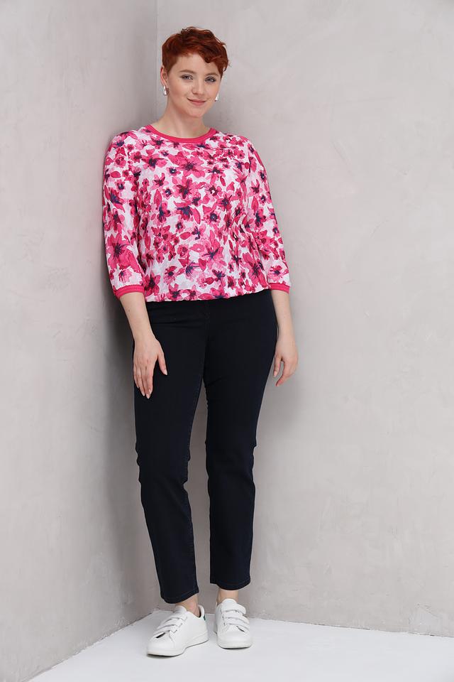 Эта стильная блуза от Rabe collection выполнена в нежно-розовой цветовой гамме и украшена ярким цветочным принтом, который придает ей романтичный и женственный вид.