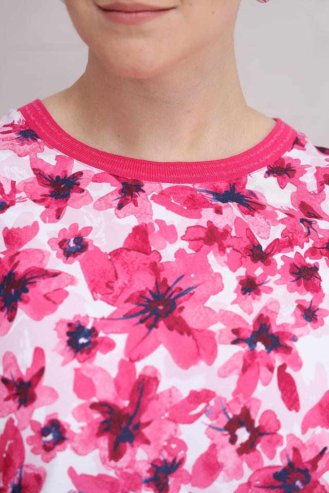 Изготовленная из 100% вискозы, блуза приятна к телу, хорошо дышит и легко стирается. Округлый вырез горловины и короткий рукав дополнены розовой отделкой, что придает блузе завершенный вид.
