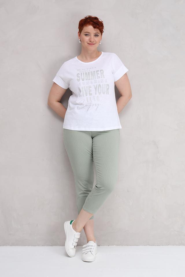 Особенностью данной модели является яркий и стильный принт с надписями "SUMMER", "SUNSHINE", "LIVE YOUR LIFE" и "Enjoy", выполненный в светло-серых тонах. Принт добавляет футболке легкости и позитивного настроения.