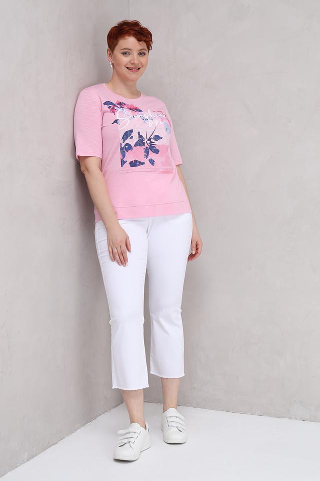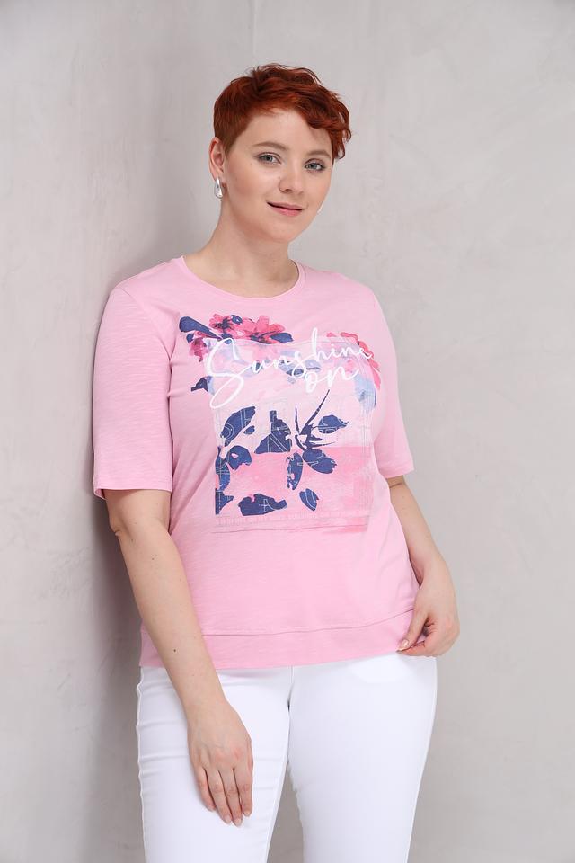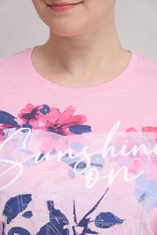 Розовая футболка от Rabe collection с цветочным принтом и надписью "Sunshine on". Изготовлена из мягкого хлопка с модалом для комфорта и приятных ощущений. Идеальный выбор для создания повседневного образа. Состав: хлопок 50%, модал 50%