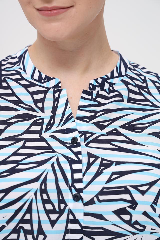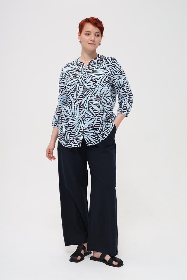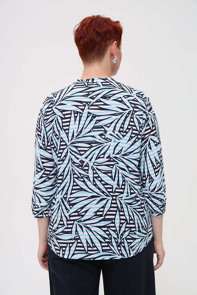Блуза имеет оригинальный принт в виде стилизованных листьев, выполненный в сочетании голубого и черного цветов. V-образный вырез горловины и рукава длиной 3/4 придают модели элегантный и женственный вид.