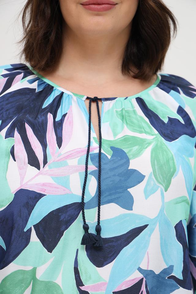 Блуза Rabe collection бирюзового цвета с ярким цветочным принтом станет отличным дополнением к вашему гардеробу. Модель выполнена из мягкой вискозы, имеет округлый вырез и завязки с кисточками. Состав: вискоза 100%