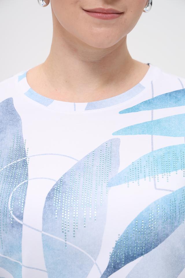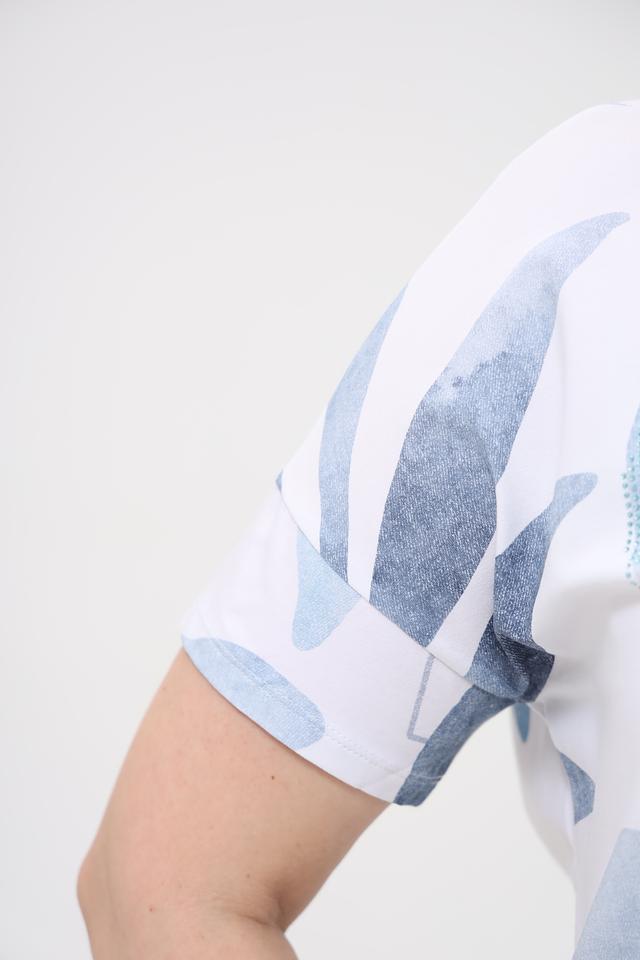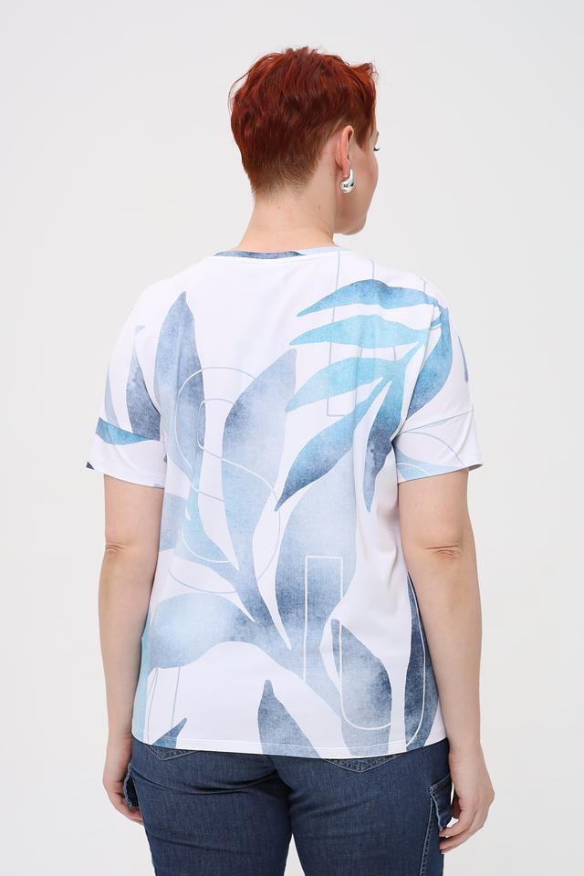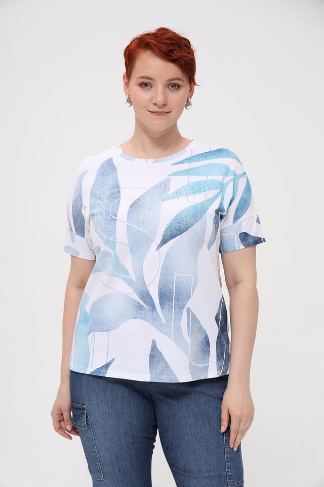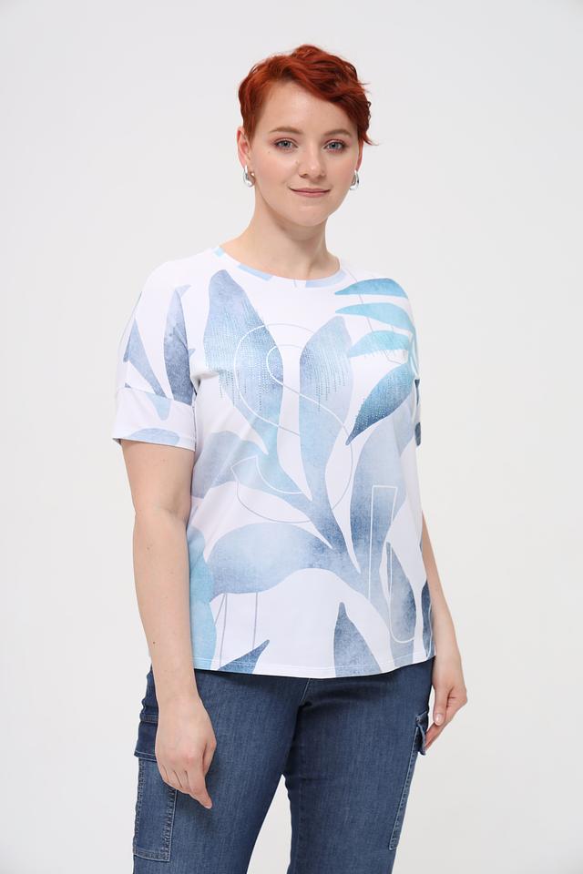 Основной цвет футболки – белый, но её украшает яркий и необычный принт в голубых тонах, изображающий абстрактные листья. Такой рисунок делает эту модель особенно привлекательной и оригинальной.