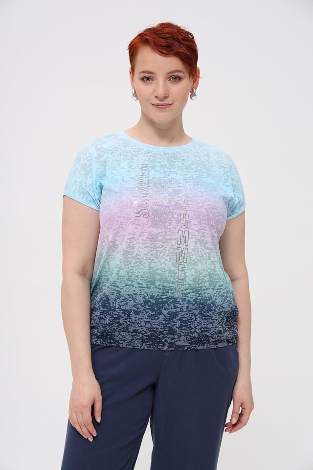 Женская футболка Rabe collection нежно-голубого цвета с градиентным переходом и надписью "SUMMER" станет отличным дополнением к летнему гардеробу. Модель выполнена из мягкого и приятного к телу сочетания хлопка и полиэстера. Состав: полиэстер 50%, хлопок 50%