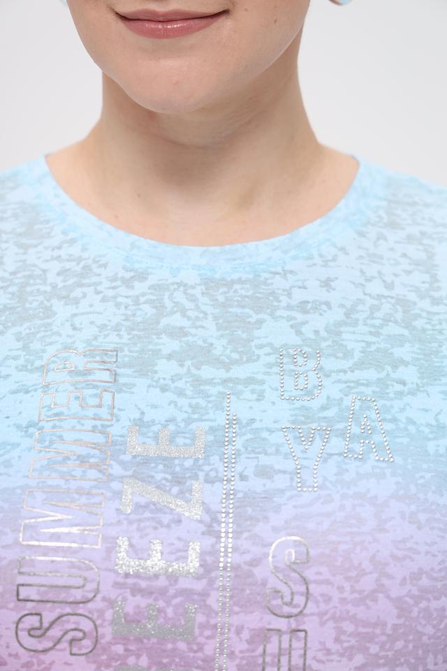 Особенностью данной модели является градиентный переход цвета от нежно-голубого к фиолетовому и темно-синему, создающий эффектный визуальный эффект. На передней части футболки расположена надпись "SUMMER", выполненная в блестящем стиле.
