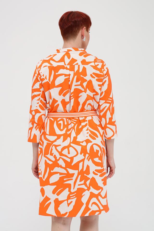 Платье имеет яркий оранжевый цвет с абстрактным белым принтом, который придает ему оригинальность и неповторимость. Модель с рукавами три четверти и V-образным вырезом. Талия подчеркнута приталенным силуэтом и съёмным поясом.