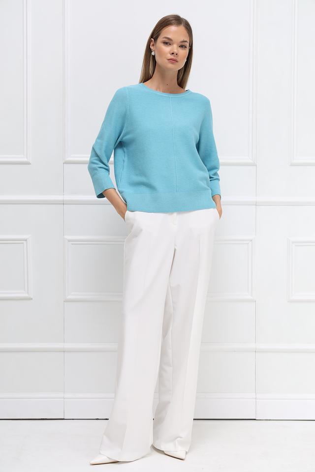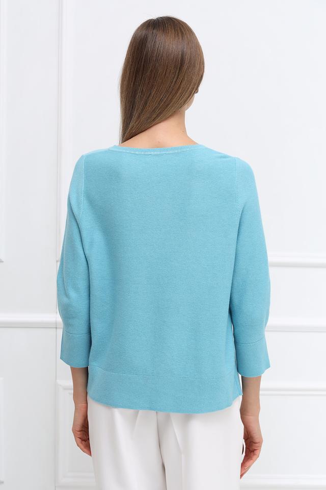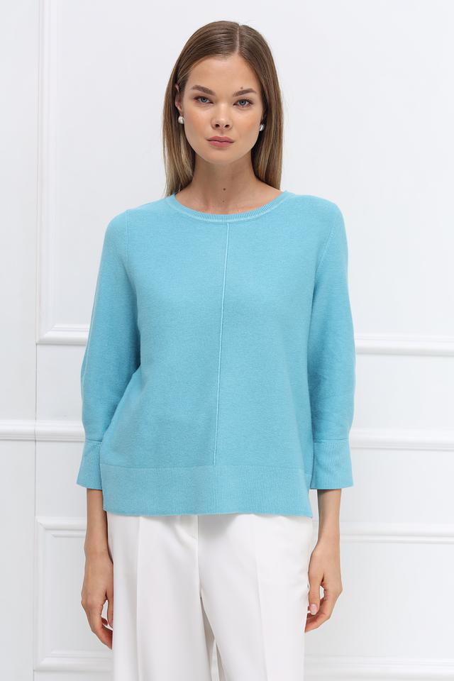 Пуловер имеет рукав три четверти и круглый вырез горловины, что придает ему классический и элегантный вид. Текстура трикотажа мягкая и приятная на ощупь, благодаря составу: 50% вискоза, 27% полиэстер и 23% полиамид. Такое сочетание материалов обеспечивает комфорт при носке и сохраняет форму изделия.
