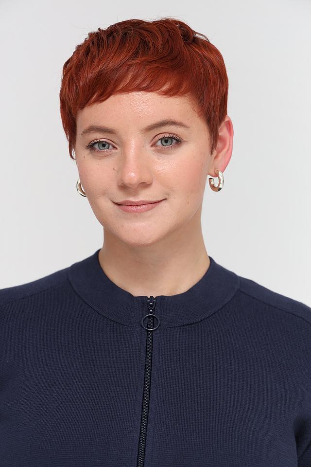 Жакет имеет удобную застежку-молнию, воротник-стойку и длинные рукава. Нижняя часть жакета декорирована контрастной тесьмой, а по бокам предусмотрены завязки, которые позволяют регулировать силуэт и создавать более приталенный образ.