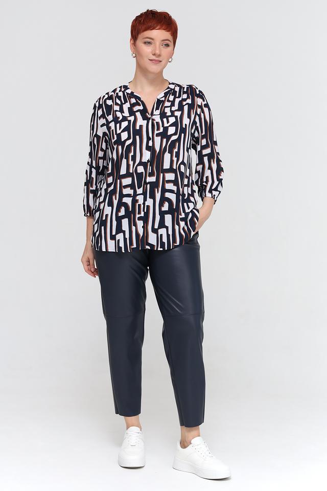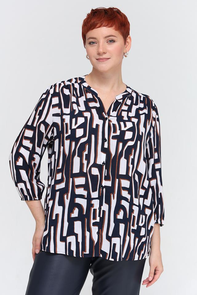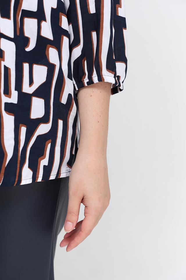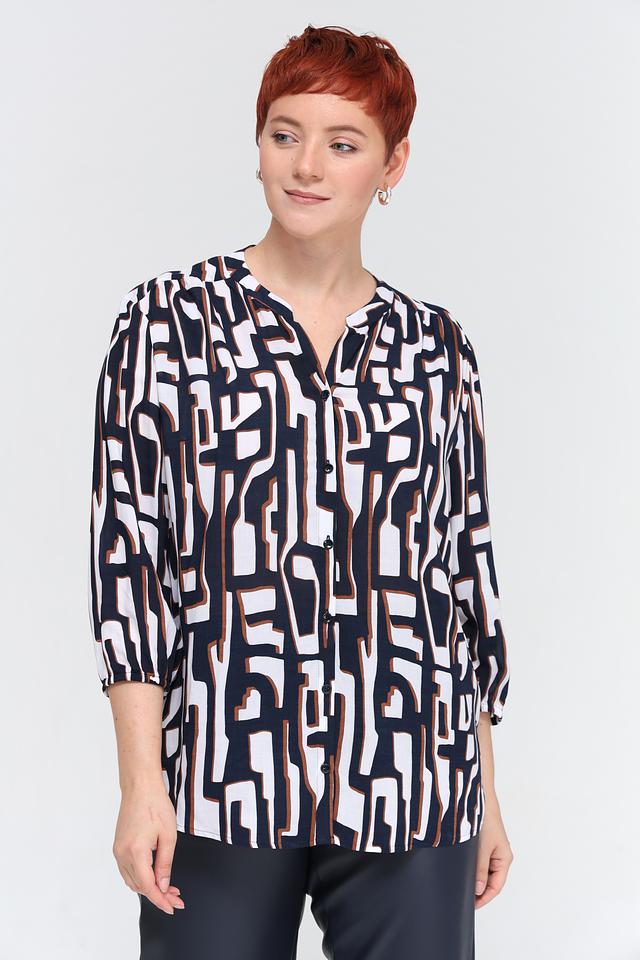 Блуза имеет оригинальный принт, сочетающий в себе оттенки синего, белого и коричневого. V-образный вырез горловины и рукава длиной 3/4 придают модели элегантный и женственный вид.