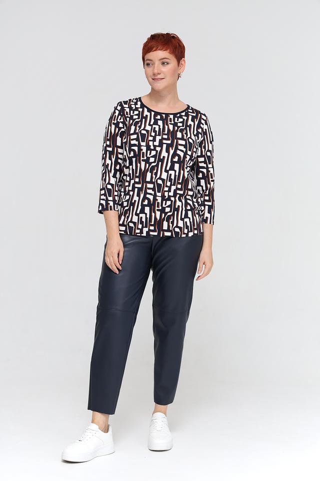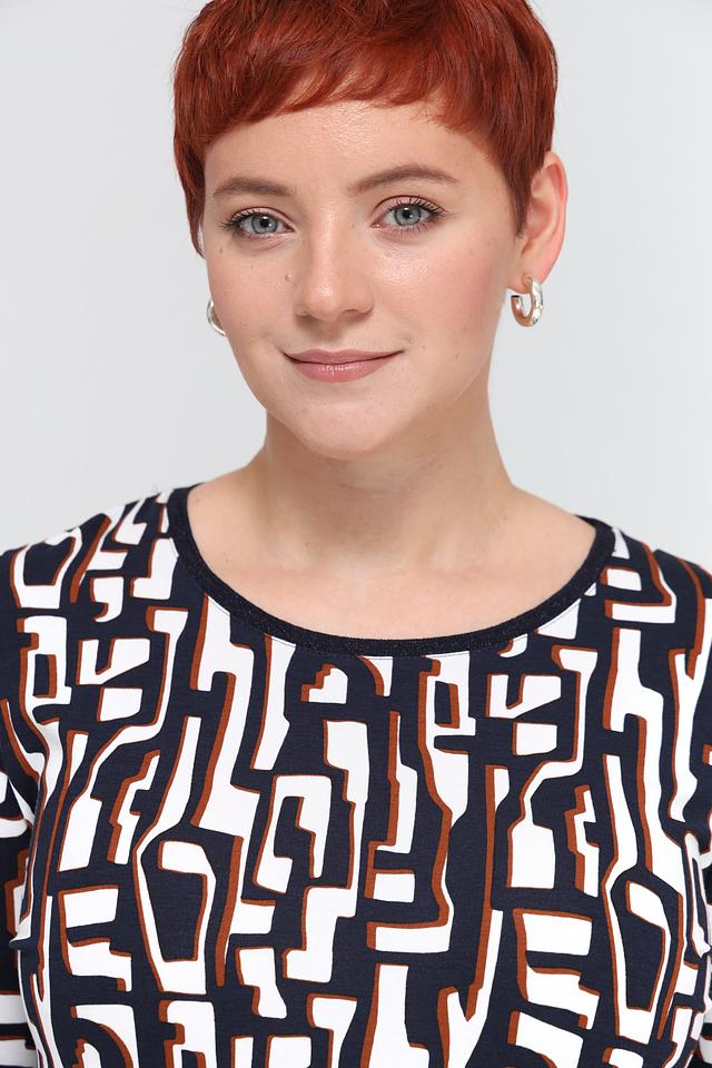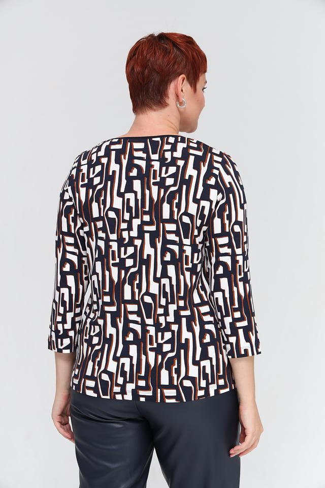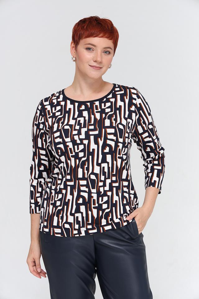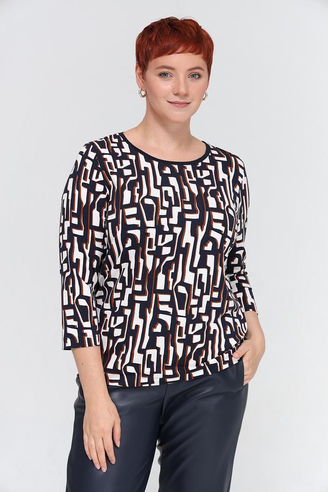 Футболка имеет прямой крой и короткий рукав 3/4, что делает ее универсальной для различных образов. Главная особенность модели – яркий геометрический принт, выполненный в сочетании белого, коричневого и темно-синего цветов. Этот принт добавляет футболке оригинальности и привлекательности.