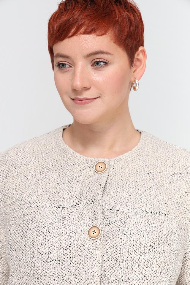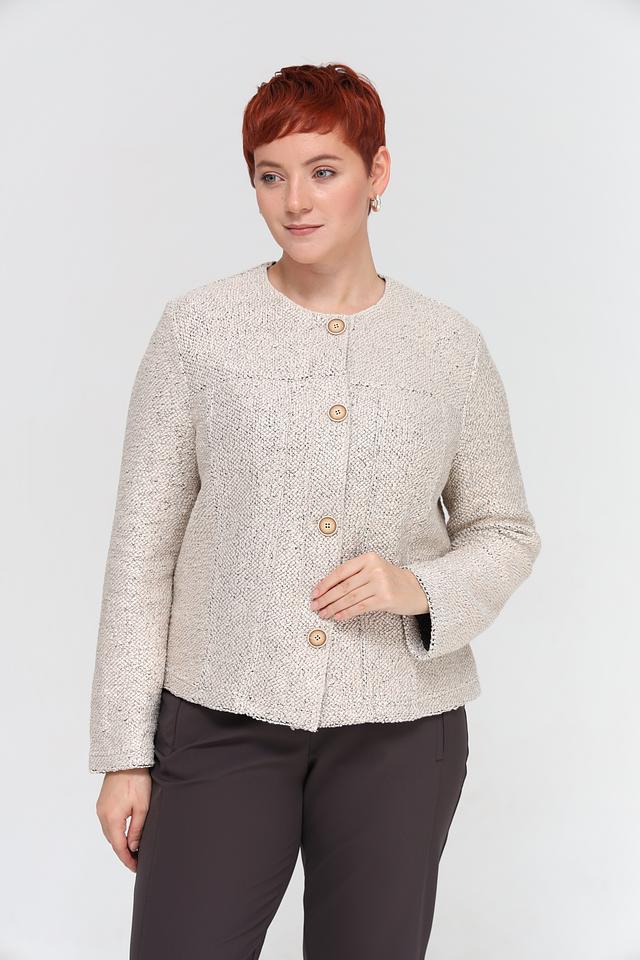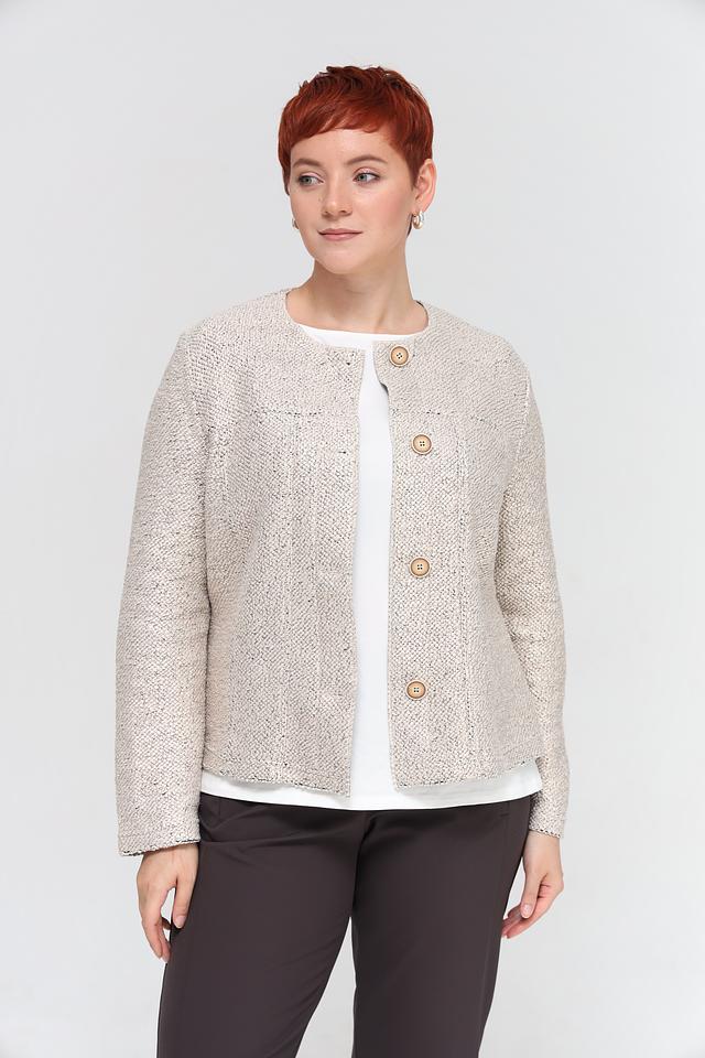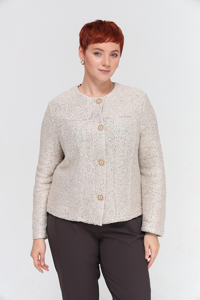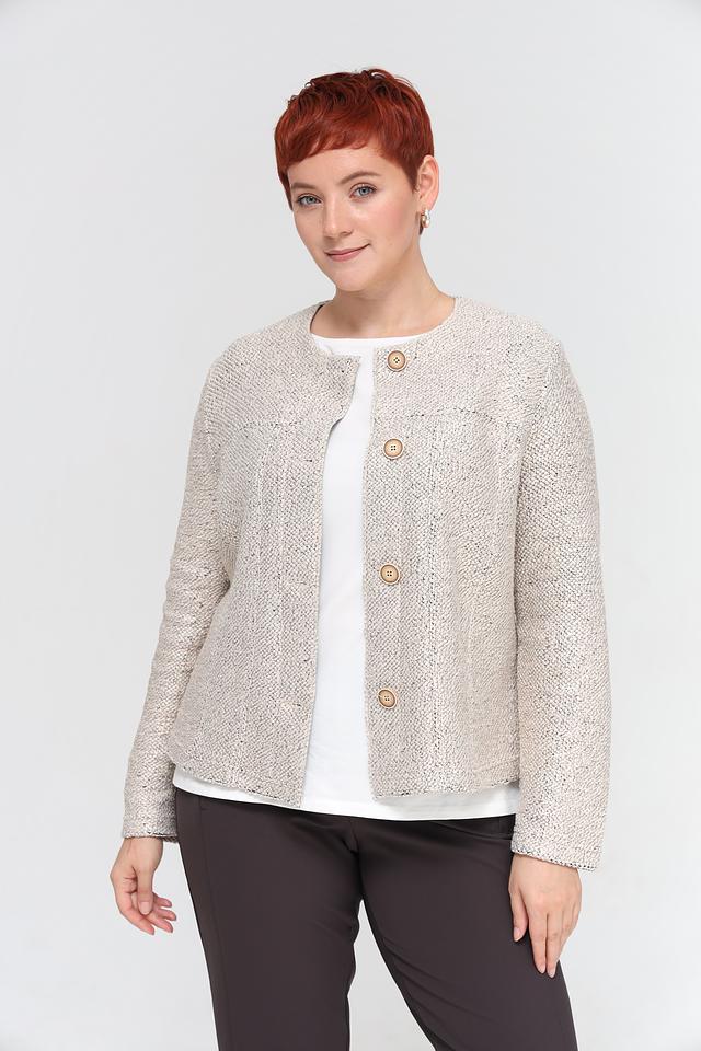 Жакет застегивается на ряд пуговиц, что позволяет регулировать степень прилегания. Изготовлен из качественной смесовой ткани, состоящей из 70% хлопка, 20% полиэстера и 10% вискозы. Такой состав обеспечивает комфорт в носке, хорошую посадку и устойчивость к сминанию.