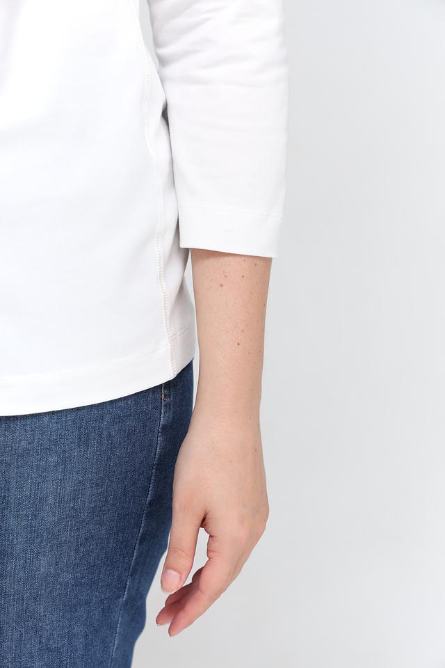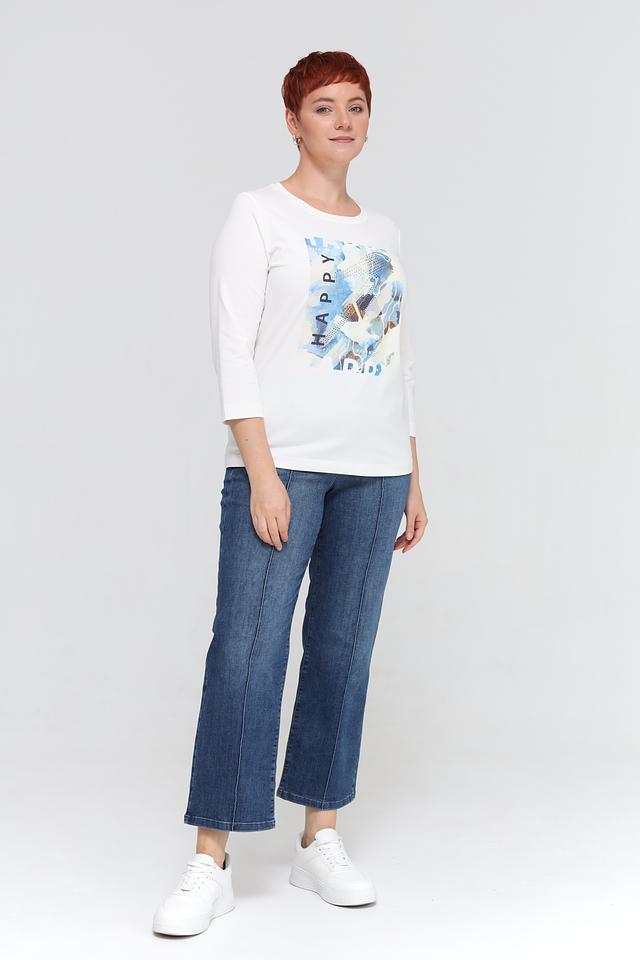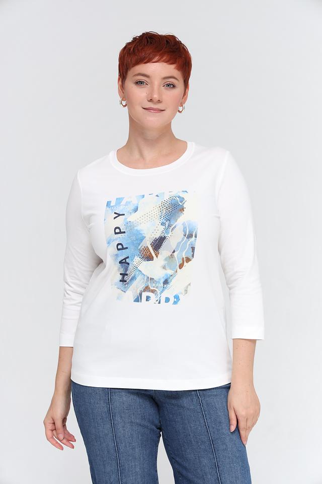 Белая футболка Rabe collection с оригинальным принтом и рукавом 3/4. Изготовлена из мягкого хлопка с добавлением эластана для комфорта и хорошей посадки. Состав: хлопок 92%, эластан 8%