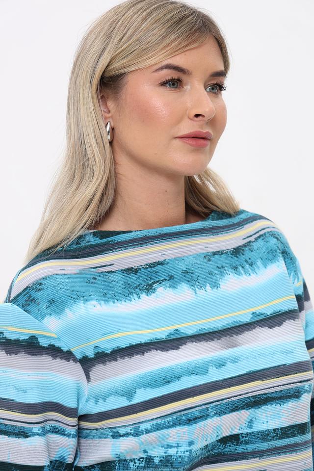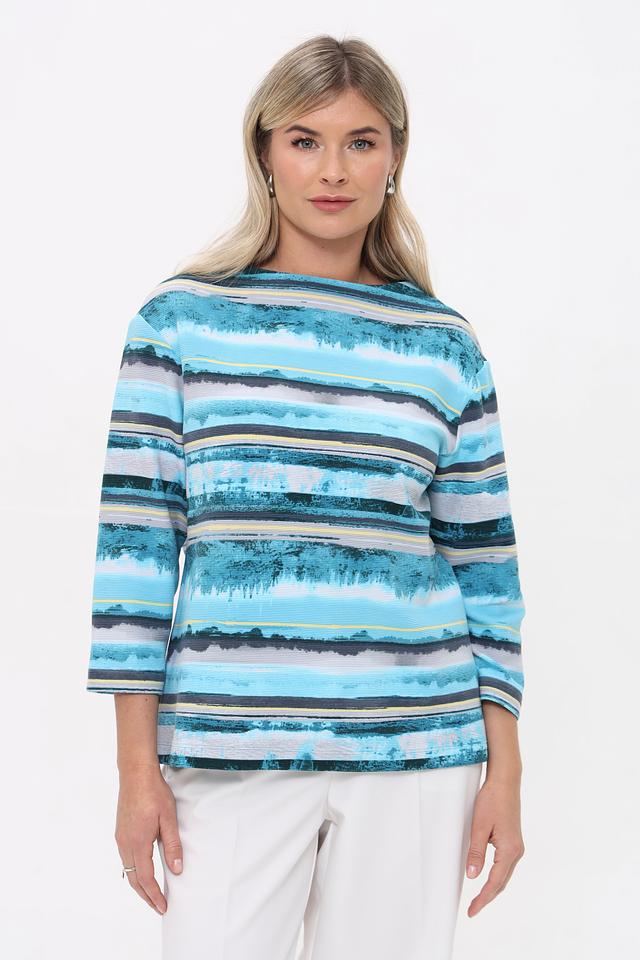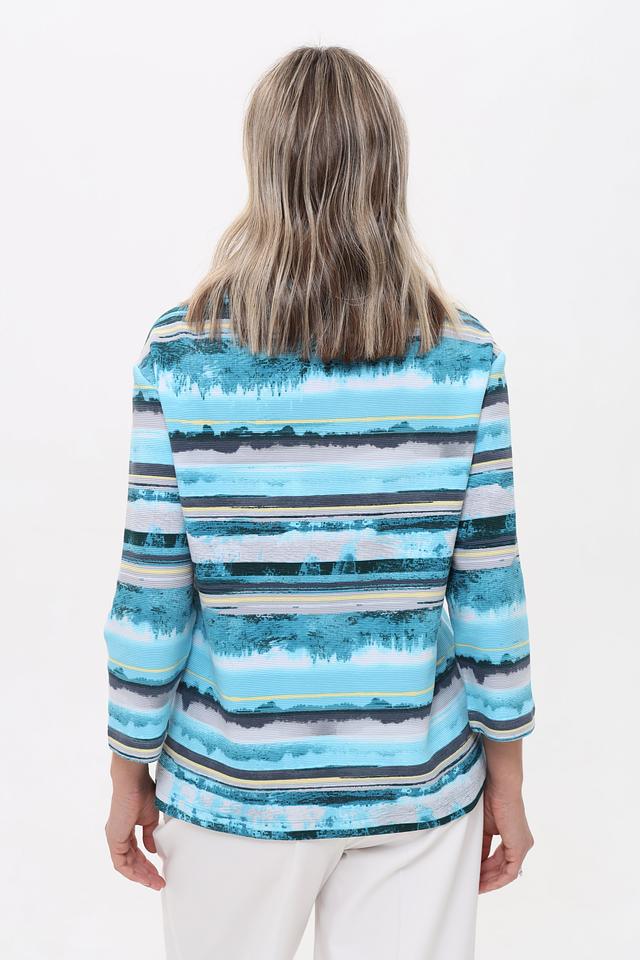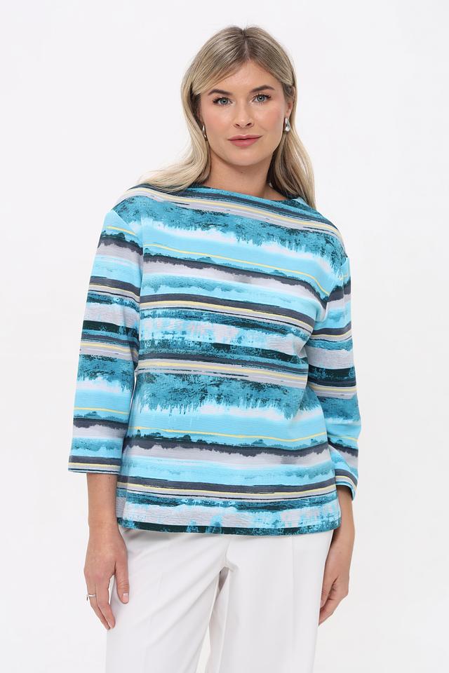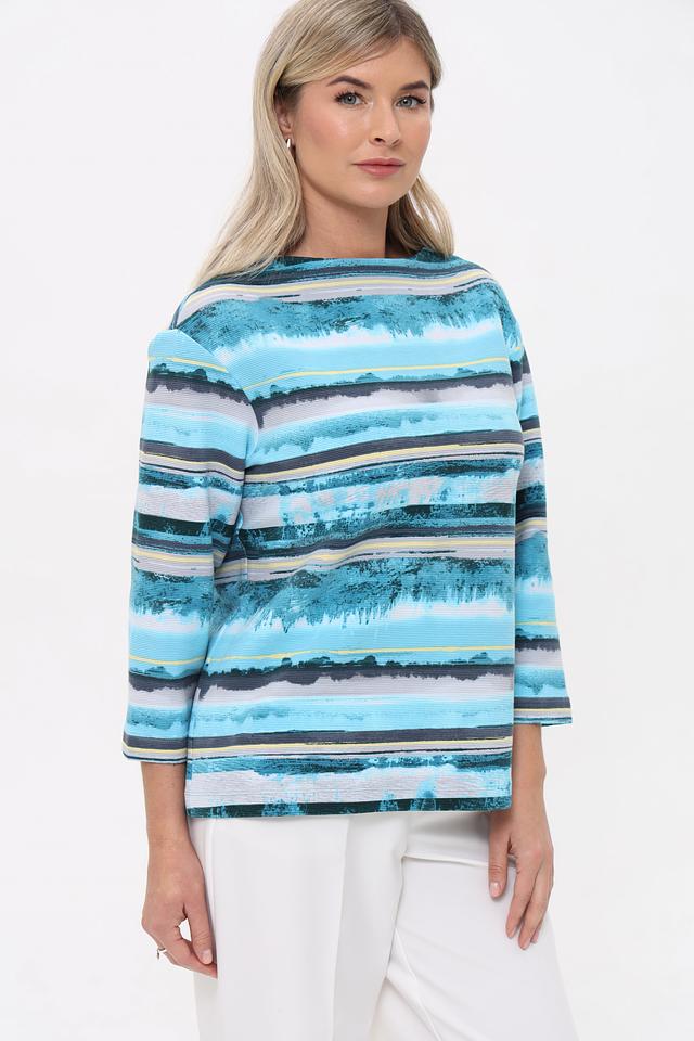Женская футболка Rabe collection бирюзового цвета с ярким полосатым принтом. Изготовлена из мягкого хлопка с добавлением полиэстера и эластана для комфорта и сохранения формы. Состав: хлопок 76%, полиэстер 16%, эластан 8%