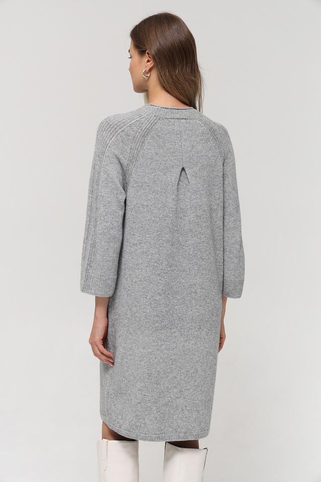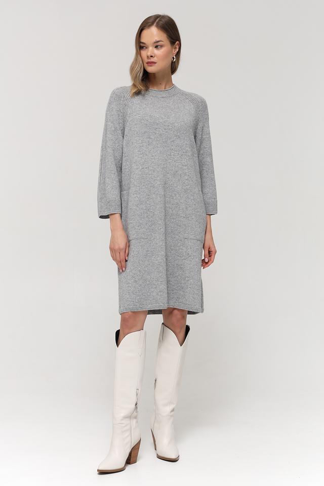 Платье имеет прямой силуэт, длину до колена и удобный круглый вырез горловины. Рукава – три четверти, слегка расширенные к низу. Трикотажная структура ткани придает платью уютный и непринужденный вид.