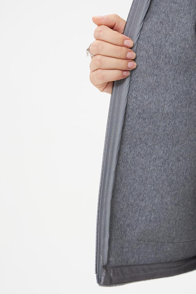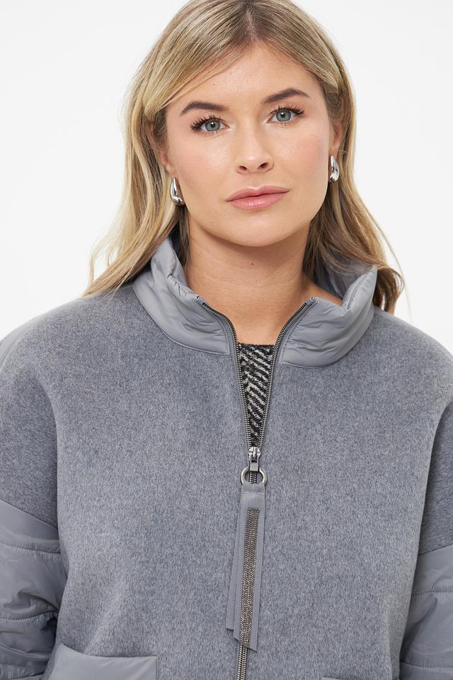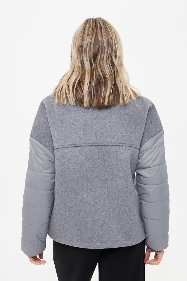 Куртка выполнена в сером цвете и имеет комбинированную фактуру: гладкая ткань и стеганые элементы. Застежка-молния позволяет легко надевать и снимать куртку, а воротник-стойка защищает от ветра.