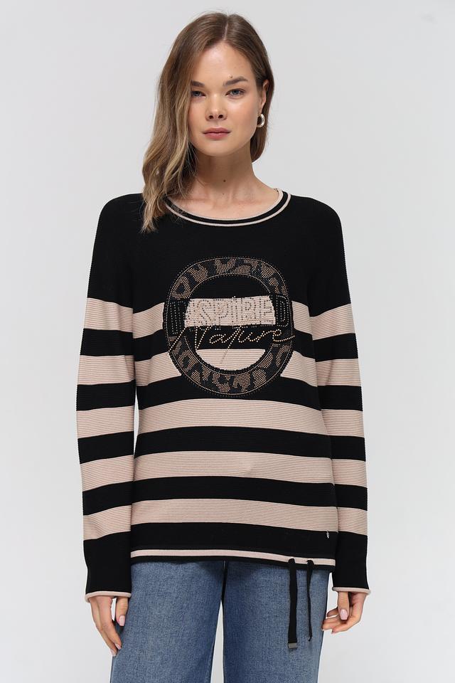 Основной цвет изделия – чёрный, дополнен бежевыми полосами, создающими эффектный контраст. Передняя часть пуловера украшена крупной декоративной аппликацией с блестящими элементами, придающей изделию изысканность.