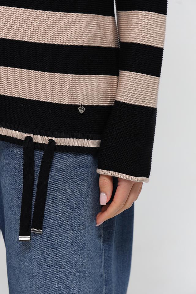 Женский пуловер Rabe collection чёрно-бежевого цвета с полосатым узором и декоративной аппликацией. Изготовлен из мягкого сочетания хлопка и полиакрила, обеспечивающего комфорт и удобство в носке. Состав: хлопок 50%, полиакрил 50%