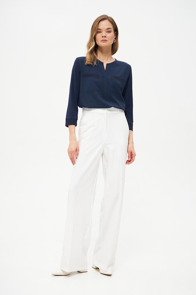 Блуза имеет прямой крой, V-образный вырез горловины и короткие рукава 3/4, отделанные кружевом. На передней части расположены два накладных кармана, также декорированные кружевом. Спинка блузы имеет небольшую складку для более свободной посадки.