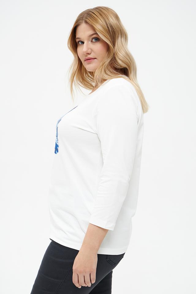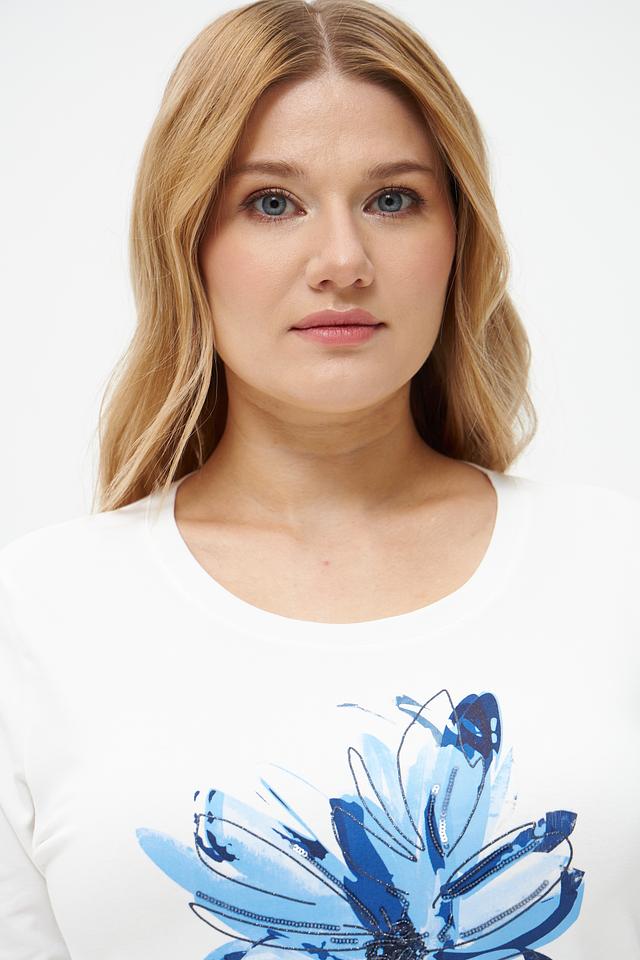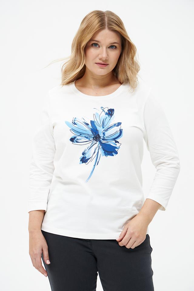 Эта стильная футболка от Rabe collection выполнена в белом цвете и украшена ярким цветочным принтом синих оттенков. Модель имеет прямой крой и удобную длину рукава 3/4, что делает ее универсальной для различных образов.
